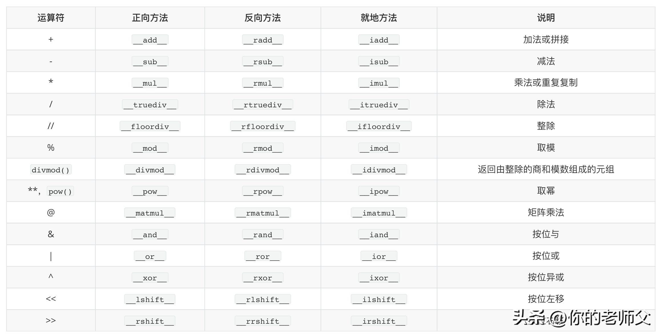 Python中的运算符重载方法非常多,这里只介绍常用的运算符和它们的重载方法。