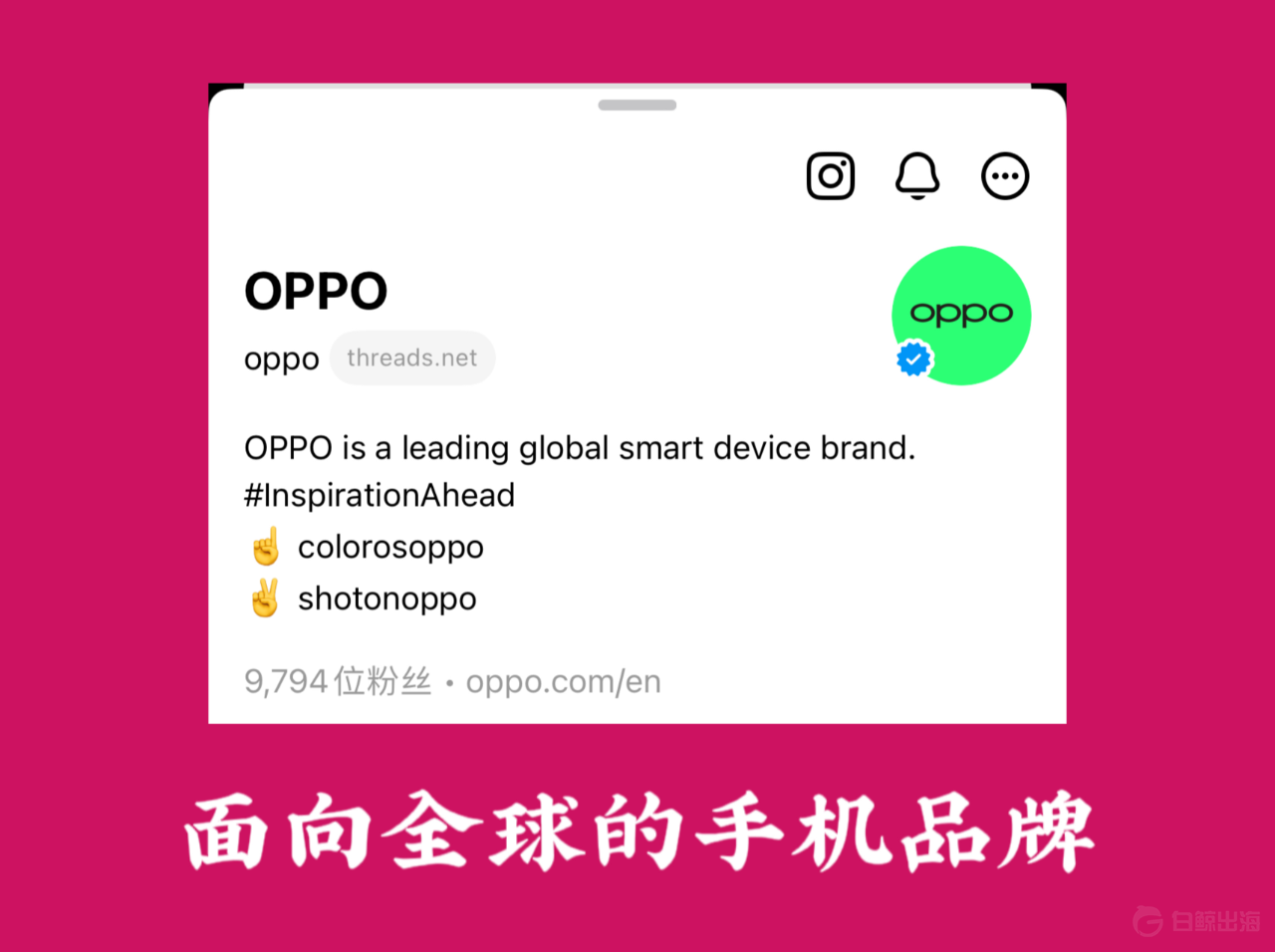 OPPO 作为一款中国起家面向全球的手机品牌,紧盯这次难得的品牌营销机会,早早入驻了 Threads,目前已经积累了 1 万位粉丝。