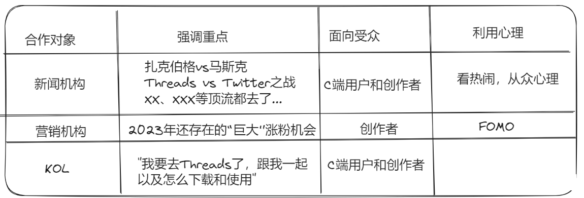 而整体上,Threads 通过和主要 3 类机构和人群合作,通过强调不同的重点,同时将 Instagram 内的创作者和普通用户往 Threads 转移,实现双边冷启动。同时,不论哪一类广告,都在强调 Threads 的低门槛,有 Instagram 账户可以直接 copy 个人资料和关注的人,产品使用上差不多和 Twitter 一样。
