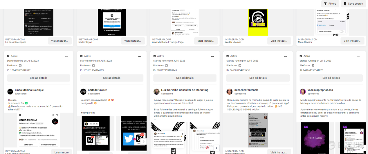 而后,Threads 的预热,有一部分也围绕“扎克伯格 vs 马斯克”或者“IG 版 Twitter 和正主之战”展开。通过观察 Facebook Ads Library,可以看到,7 月初、尤其是上线前两天,Threads 比较密集地投放广告。一个策略就是在 Instagram 和 Facebook 两个自家平台上,通过投放新闻媒体来炒作上面的话题,进一步放大影响。