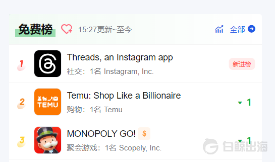 在这之外,Threads 还做了两件事情,一个是提前一天在 Instagram 内搞了一个 Threads 的预注册入口,一是给到用户仪式感,对于屡屡发布新产品、失败记录也很多的 Meta 来说,阵势还是要有的,同时,也配合今天冲榜。到下午去看榜单,已经是美国总榜第一,把霸榜 20 多天的 Temu 拉了下来。