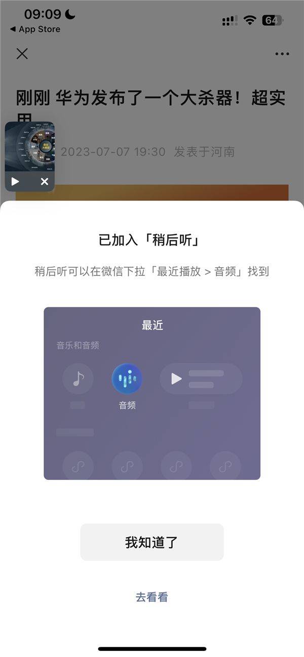 如果暂时不方便听,还可将文章加入“稍后听”,可在微信界面下拉“最近播放”中的音频找到该文章。