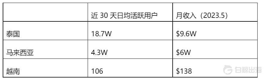 此次下载量增长主要出现在印尼、菲律宾和新加坡市场。而观察其他东南亚市场发现,泰国市场在今年年初已经出现下载量和 DAU 的明显增长,而马来西亚市场的增长则出现在 2022 年 10 月份。目前这两个市场下载量和 DAU 已经趋于稳定,并获取了稳定的收入。而越南市场,貌似被 WePlay 忽略了。为什么整个东南亚,单独漏掉了越南市场,如果有读者了解的话,希望能够加作者一起多做探讨。