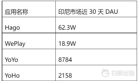 7 月 6 日,Hago 印尼的 DAU 为 59.3 W、WePlay 印尼的 DAU 为 30.4 W,但因为两者所处阶段不同,30 天平均 DAU 上,WePlay 数据因为快速增长,还是较低,大约在 Hago 的 30% 水平。