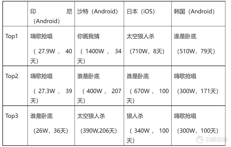 笔者观察了近 90 天针对印尼市场的广告素材发现,作为主推游戏太空狼人杀出现频率很低,而投放天数与展现次数均比较高的广告素材都是关于嗨歌抢唱和谁是卧底的。这两个游戏几乎是WePlay中,竞技属性最弱而社交属性最强的两款游戏。笔者又观察了印尼、日本、韩国、中东市场的广告素材情况,并针对单个游戏的广告素材按展现次数和投放天数进行排名。