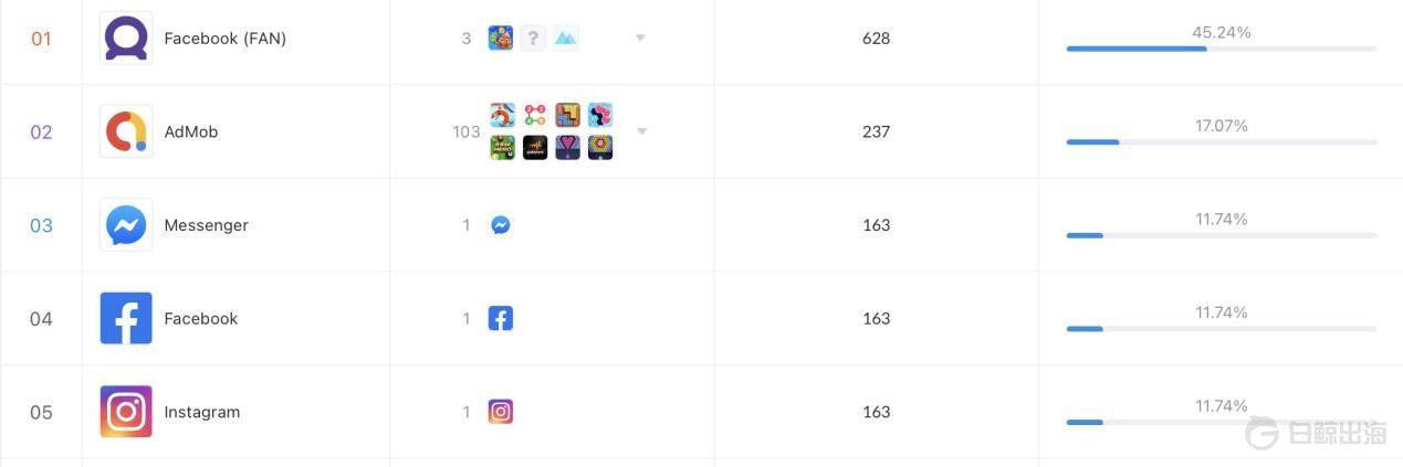 观察近90天的投放渠道占比,Facebook Audience Network(FAN)占 45%,Google 的广告平台 AdMob 占 17%,之后是 Facebook 的自有 App。从投放位置来看,FAN 和 AdMob 的展示广告位都在一些益智游戏中,比如《梦幻水族箱》等,除此之外还有一些工具 App 和修图 App 等。以 WePlay 变现最好的日本市场来对比,虽然投放渠道不同,但主要投放位置差不多,集中在小游戏、益智游戏、以及修图 App。