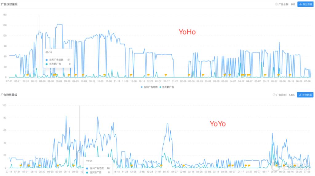 YoYo和YoHo近一年广告投放量 | 来源:App Growing Global