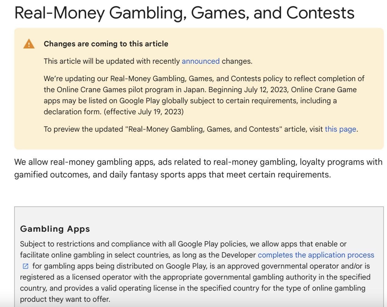 谷歌关于真金博弈、游戏和竞赛的相关规定 | 图片来源:Google