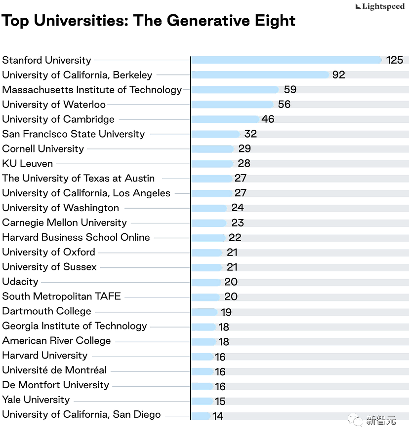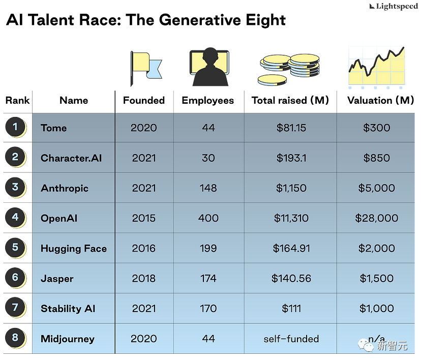 根据公开的员工信息,如学校教育、高级学位、曾就职公司、工作年限、专利、出版物等进行排名,从3500多家从事生成式人工智能业务的公司角逐出八家以AI研发为核心的公司。