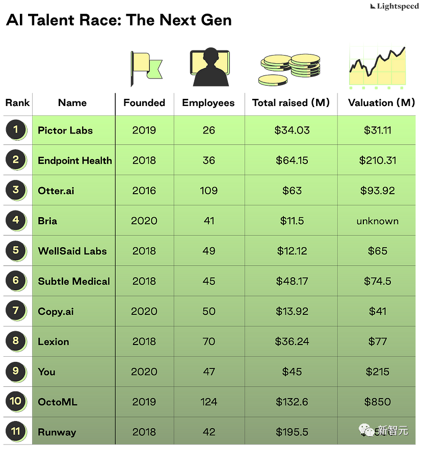 除了八家领头公司外,文章还统计出11家非常有潜力的,将模型应用于实际场景、直接对接用户的公司,也许就是下一次AI技术革新的领头羊。