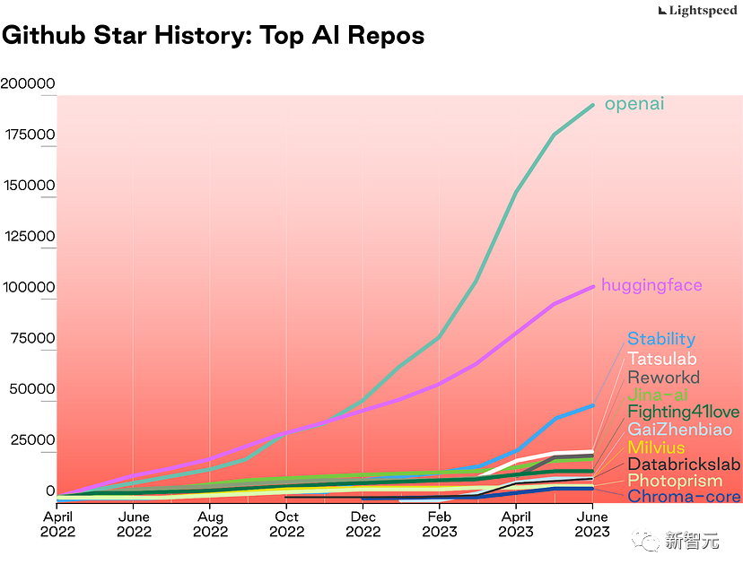 出于这个原因,Github上相关的人工智能项目stars数量也能展现出一定的技术趋势,任何人都可以做出贡献并学习如何开发人工智能应用程序,最近已经开始呈爆炸性增长,特别是OpenAI在2022年11月30日向公众发布ChatGPT后。