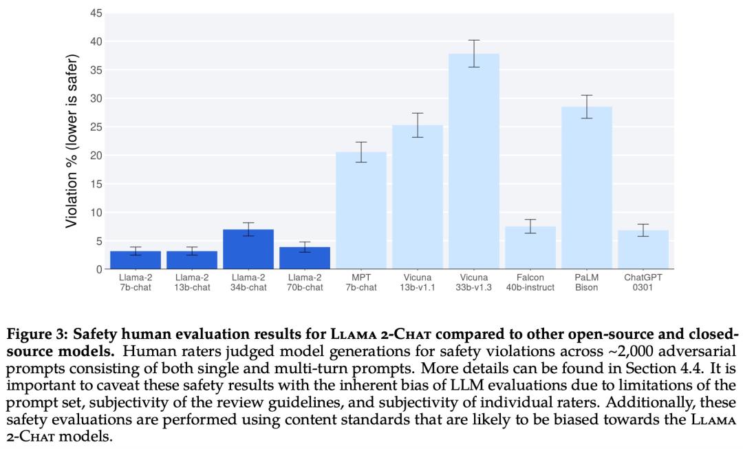 Llama 2-Chat 与其他开源和闭源模型在安全性人类评估上的结果。