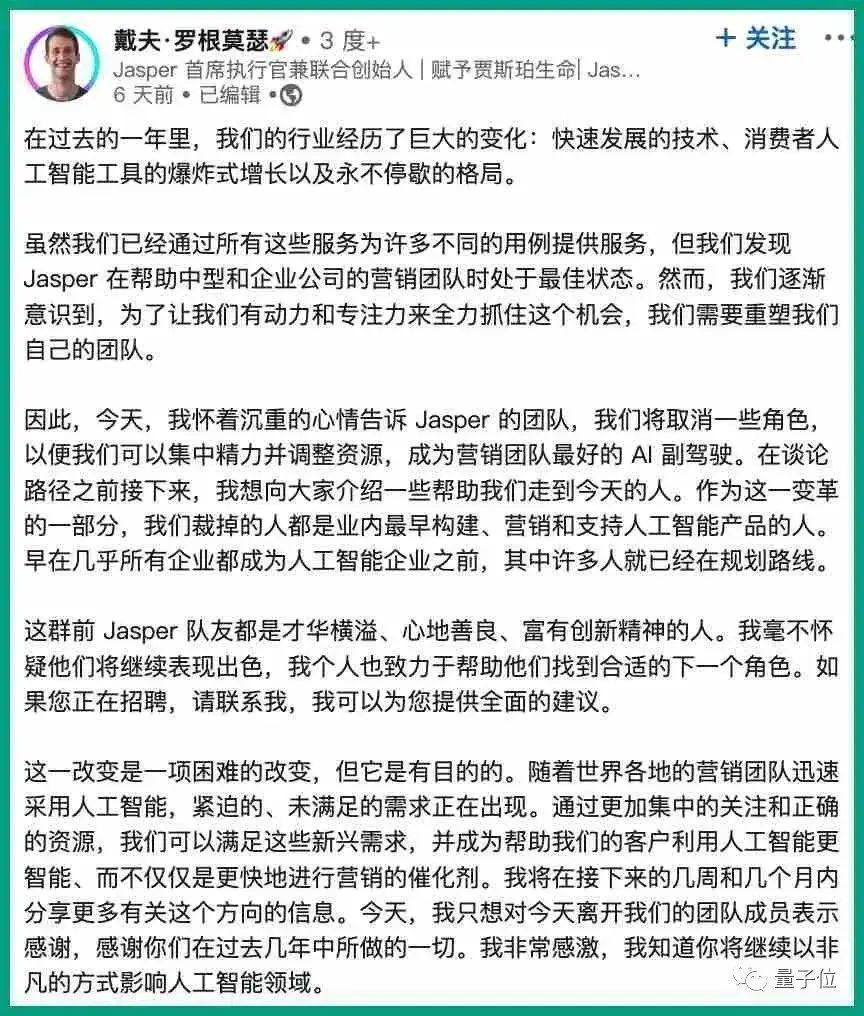 因GPT-3起家,又因ChatGPT受到冲击。面对Jasper此次的大裁员,有网友表示: