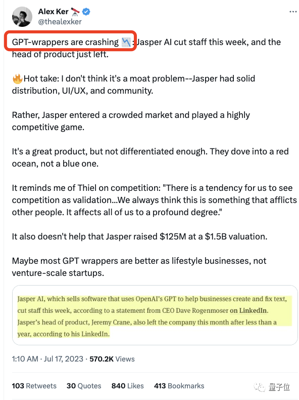 还有人借此形容当下AIGC应用初创公司的困境:GPT套壳们正在崩溃。