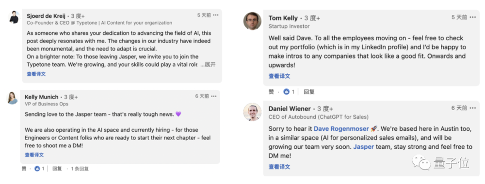 值得一提的是,在裁员公告底下,一群创业公司、风投机构闻讯而来,直接贴上自己招人需求。其中不乏Jasper直接竞争对手。