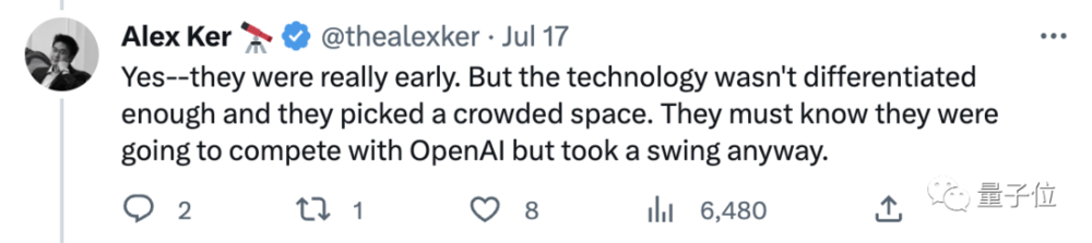 他们当时进入市场的时间的确非常早。但是技术差异化不够,并且选择了一个竞争激烈的赛道。他们肯定知道自己将要与OpenAI竞争,但仍然决定尝试一下。