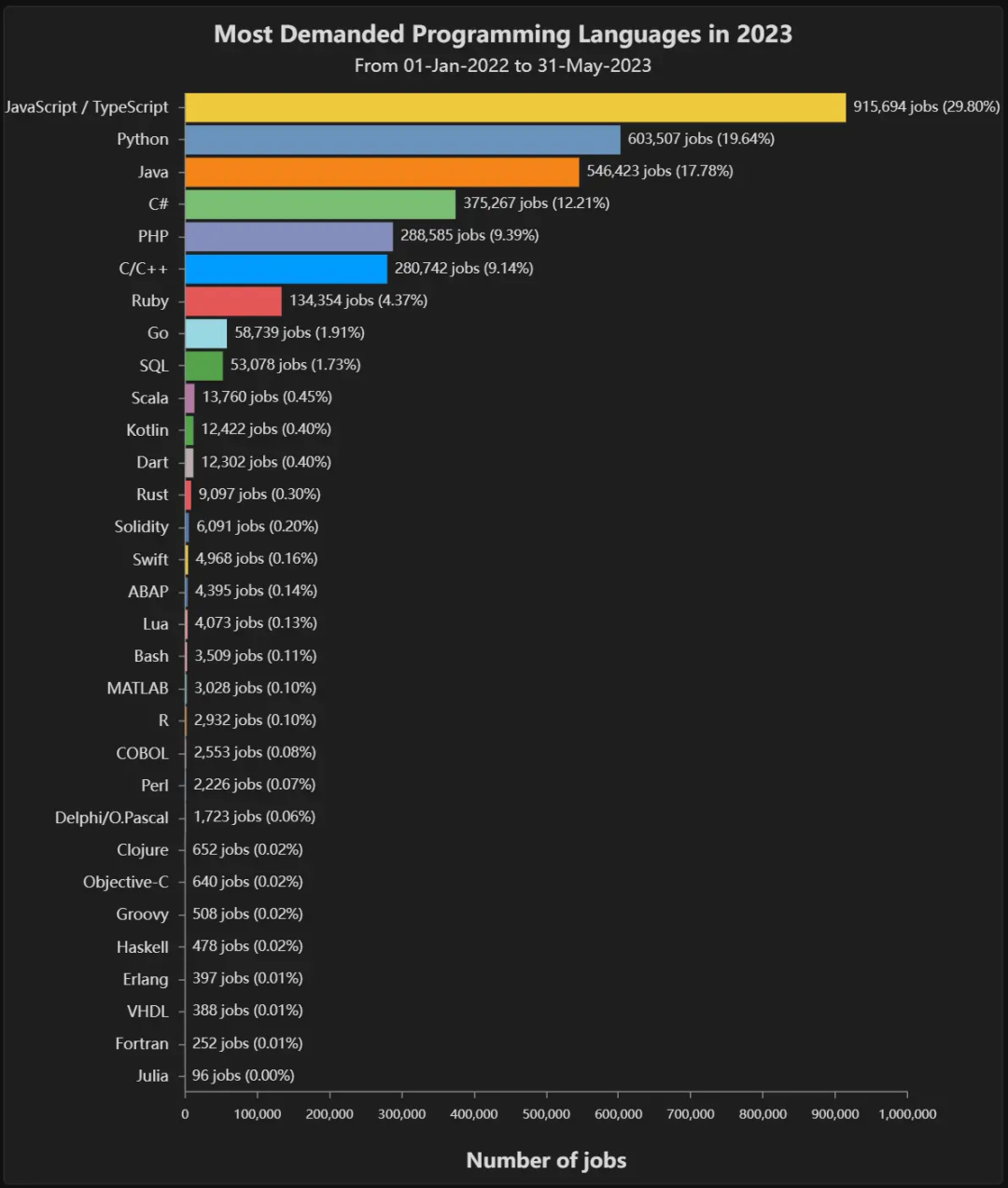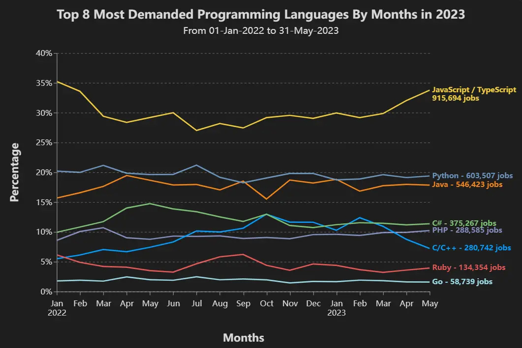 以下是2023年编程语言及其各自需求的完整图表: