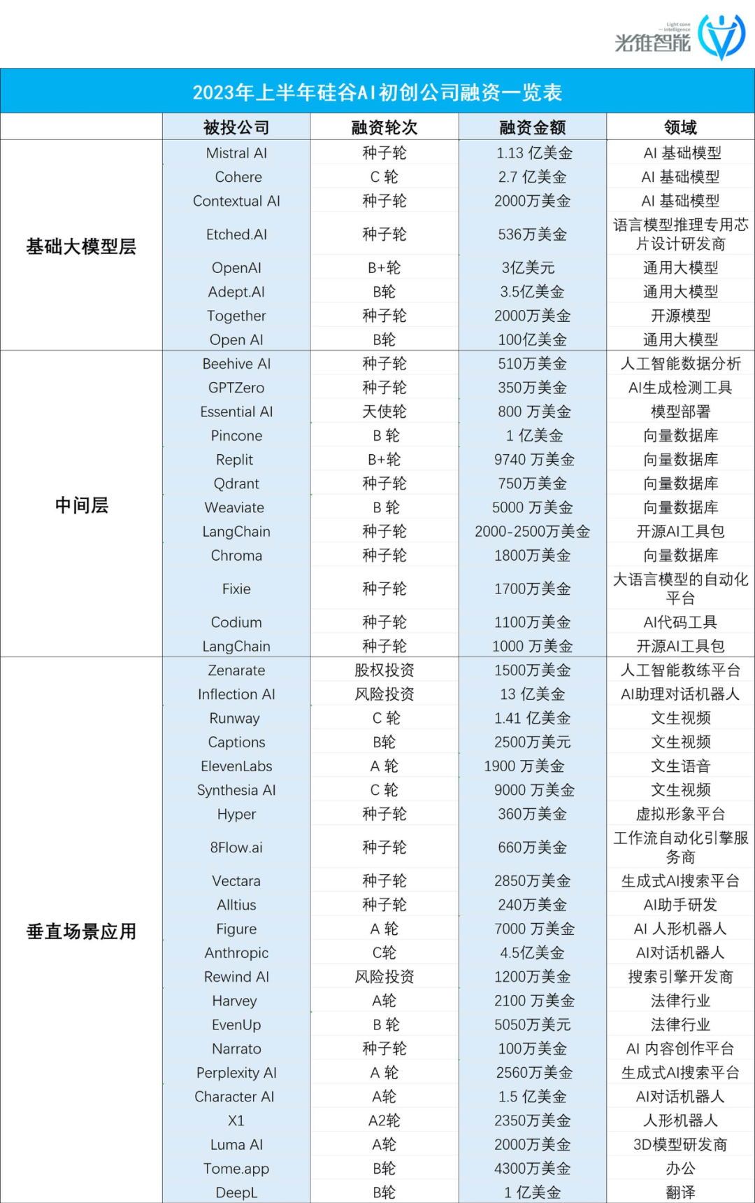 国外风投数据分析公司PitchBook数据显示,上半年全球AI领域共计发生融资1387件,筹集融资金额255亿美金,平均融资金额达2605万美金。据融资服务机构Carta数据显示,2023年Q1,美国A轮AI初创公司融资环比增长58.4%,种子轮公司估值增长了19%。热钱一半都流向了硅谷。据光锥智能不完全统计上半年硅谷一共有42起融资,总金额约140亿美元,占世界总融资金额的55%。平均轮次融资金额为3.3亿美元,是平均融资水平的近13倍之多。以OpenAI为首的AI新贵成为当之无愧的主角,在获得投资的40家公司中,有近60%的公司成立时间在一年之内。其融资轮次也处于早期阶段,42起融资事件中,种子轮次占了40%,B轮以前(包含B轮)占了86%。孔祥来告诉光锥智能,硅谷这波创业大多采取小而精方式,早期创业项目团队的人数在3-5人,中期项目团队的规模也控制在十几人~几十人之间,当初Midjourney效果惊艳全世界,凭借早期11个人的团队就做到了一亿美金的营收,“AGI领域更重视技术创新,堆人没有用。”孔祥来直言。这跟国内创业方式有很大不同,国内创业团队人数普遍较多,比如媒体报道称王慧文的光年之外解散前有70人,王小川公开信中透露百川智能最初组建人数为50人。不过,硅谷AI创业团队规模虽然普遍偏小,但其吸金能力却十分惊艳。截至目前,按融资金额数量的AIGC初创公司的排名分别为:OpenAI(113 亿美元)、Inflection(15.25 亿美元)、Cohere(4.45 亿美元)、Adept(4.15 亿美元)、Runway(1.955 亿美元)、Character.AI(1.5 亿美元)和 Stability AI(约 1 亿美元)。站在他们背后的,仍是科技圈如雷贯耳的公司和大佬。光锥智能整理统计发现,上半年,微软参与的AI融资项目有5起,谷歌出手4次,英伟达出手6次,OpenAI出手3次,这些巨头加起来累计参与了约43%的AI领域融资。将目光更聚焦一些,当下硅谷对AI关注的主要集中在三个方向:一是基础大模型层;二是开发工具、数据库等所在的中间层;三是垂直应用层。程浩向光锥智能介绍,基础大模型除了OpenAI、Anthropic两家公司,其他创业者都在做开源模型;工具层创业者都在动员所有人才精英做开源社区,其核心壁垒在于创造开发者生态;应用层聚集着两类创业公司,一类是像法律、HR招聘垂直领域的公司,一类是与文案、文生图、文生视频相关的通用型公司。应用层普遍扎堆B端,C端产品少很多,属于在巨头夹缝中求爆款的状态。从不同机会层面来看,上半年,硅谷基础大模型层有8起融资,中间层有12起融资,垂直应用层面有23起融资。不过,在融资金额上却呈现反比,分别融资金额为110.8亿美元、3.5亿美元和25.2亿美元。表面上看,基础大模型层似乎是最热的投资领域,但实际上完全由OpenAI一家撑起来,如果把OpenAI的103亿美元巨额融资剔除,整个垂直大模型层的融资占比就直接从79%骤降至21%。从上图可以看出,目前垂直应用层面是硅谷最热的投资领域,融资次数多,但单次融资金额不高;基础大模型层OpenAI占据绝对的领先地位,其他大模型公司虽然单轮次的融资较高,但难以与OpenAI相匹敌,其业务范畴也在弥补OpenAI的不足;中间层是VC们近期发掘的新大陆,目前,已投出了估值7.5亿美金的向量数据库公司Pincone,半只脚踏入了独角兽行列。孔祥来表示,“硅谷投资人内部分为了两派,一类只看好OpenAI,认为未来OpenAI会统治2C端应用,因而没必要在C端应用领域投入过多时间,转而去投B端与行业深度整合的AI公司;另一派则持相反态度,积极拥抱开源社区,也会看好2C端的垂直应用,认为在该领域也可以跑出独角兽公司。”总体而言,今年上半年以下方向在硅谷掀起了一波又一波的掘金潮:垂直应用层:文生视频、文生语音、AI对话机器人、生成式AI搜索、法律垂类领域应用、人形机器人。孔祥来补充总结表示,当下硅谷投资人重点看好几个方向,分别是AI Agents(智能体)、多模态(文生图、文生视频)、解决行业幻觉(法律、医学)、个性化方向(Character AI等对话机器人)、大语言模型的中间件以及AI深度赋能的行业场景应用。站在淘金热的风口,这些新贵们的身价随着水涨船高,2022年,ChatGPT和AIGC领域吸金超过26亿美元,共诞生出6家独角兽,而截至到今年5月8日,独角兽俱乐部的成员上升到14家(Midjourney暂无估值)。1000家VC同时举牌竞价,带来的是成立不到四个月的Baby公司,融到两轮上亿美元融资。6月29日,Inflection AI完成了13亿美元的新一轮融资,成为融资第二多的生成式人工智能初创公司,资本再次成功造神。奇迹降临硅谷的同时,淘汰赛也正式开始。仅仅半年,硅谷就已经给AI创业贡献了一波真金白银的教训。一类是像Jasper这类靠接入OpenAI API接口成长起来的公司受到了冲击。作为第一批AIGC独角兽公司,Jasper抓住了这波AI升级机会,估值飙到了15亿美元。但其问题也十分致命,套壳公司产品壁垒非常薄,它的用户体验和品牌很好,但达不到最好,很容易被那些高价值细分领域构建的差异化产品而替代,通而不精是其最大的问题。程浩认为,Jasper的最大竞争对手是ChatGPT、微软Copilot、NotionAI等巨头竞争对手,这些巨头有品牌,价格也便宜很多,所以那些相对弱需求的用户自然就不愿意继续再为Jasper买单,其根本问题在于创造的额外价值不够厚。对于Jasper这类公司来讲,核心是想办法在数据存储、多人协同以及工作流整合等方面下功夫,增大用户粘性。另一类是VC支持的聊天机器人团队,在去年的融资热潮下筹集了不少资金,期望今年能向企业销售。
