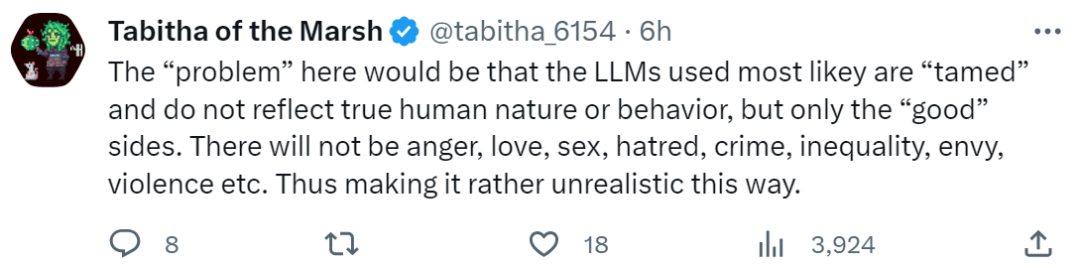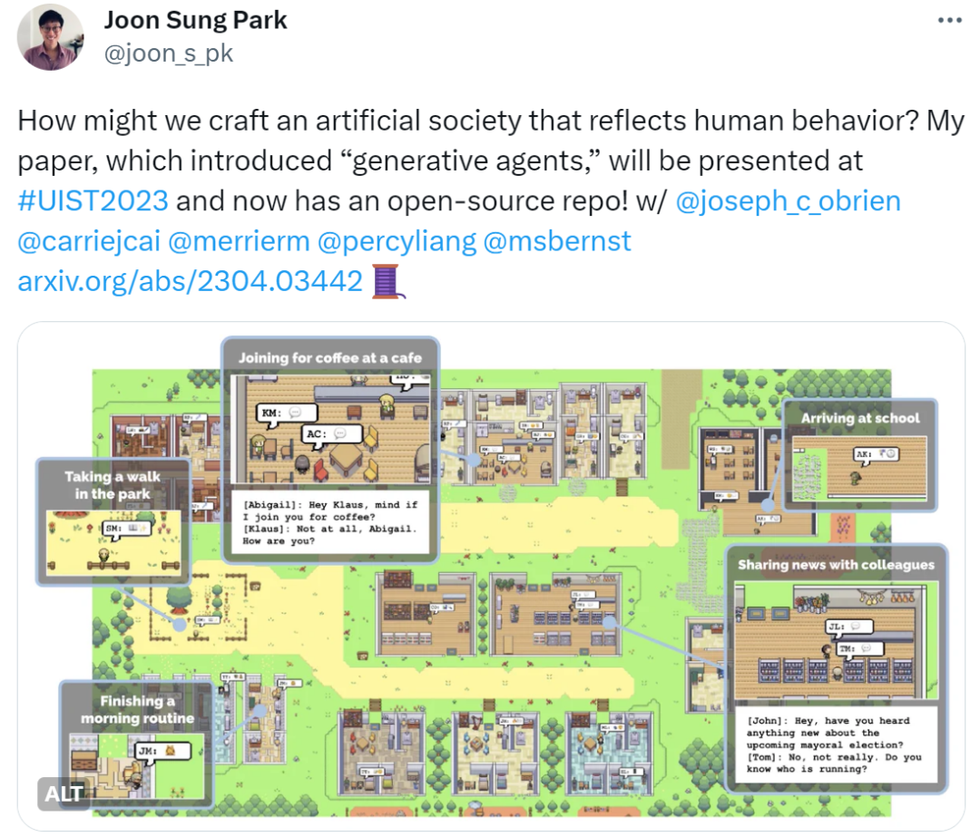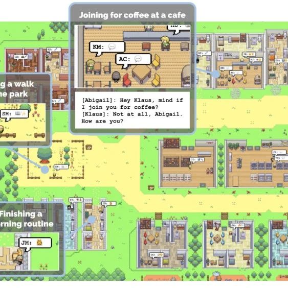 研究者们成功地构建了一个名为 Smallville 的「虚拟小镇」,25 个 AI 智能体在小镇上生活,他们有工作,会八卦,能组织社交,结交新朋友,甚至举办情人节派对,每个「小镇居民」都有独特的个性和背景故事。为了让「小镇居民」更加真实,Smallville 小镇还设置了许多公共场景,包括咖啡馆、酒吧、公园、学校、宿舍、房屋和商店。「小镇居民」可以在 Smallville 内随处走动,进入或离开一个场所,甚至去和另一个「小镇居民」打招呼。「小镇居民」的行为有多像人?举例来说如果他们看到早餐着火了,会走过去关掉炉子;如果看到浴室有人,会在外面等待;如果遇到一个想交谈的个体,会停下来聊天……可惜,当时这项研究并没有开源,大家也只能在公开的论文中挖掘更多信息。不过,随着时间的推移,现在,研究者把这项研究给开源了。斯坦福博士生、论文作者之一 Joon Sung Park 也证实了这一消息:正如网友所期待的,随着项目的开源,将会影响到更多领域,特别是游戏行业。想象一下,未来的电脑游戏可能会有整个虚拟城市的人口,每个人都有自己的生活、工作和爱好,你可以与他们互动,与真人一样。「我相信这项研究标志着 AGI 的开始。虽然我们还有很多工作要做,但这是一条正确的道路。终于等来了开源!」还有网友期待把这项研究移植到视频游戏「模拟人生」中:不过也有人对此表示担心,我们都知道,打造 AI 智能体离不开大模型的加持,但是,我们也不得不考虑这样一个问题,即 LLM 正在被人类悄悄「驯服」,因而不能完全反应人类真实的情绪和行为,而只能做出人类认为是好的行为,像愤怒、犯罪、不平等、嫉妒、暴力等很大程度上不会有了。因此,AI 智能体很难复制人类真实生活。不管怎样,此次大家对 Smallville 的开源还是很激动的。除了斯坦福开源的 Smallville「虚拟小镇」,接下来我们在列举一些其他的 AI 智能体:英伟达 AI 智能体 Voyager 接入 GPT-4,无需人类插手,就能玩《我的世界》。