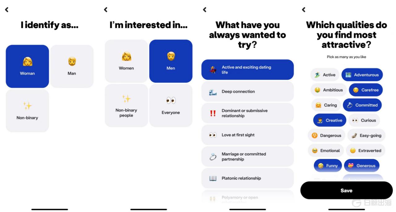 Blush 的产品使用起来相对比较方便,用户在完成关于目标匹配对象的性别、理想约会场景以及个人兴趣爱好的设置后,即可开始进行滑动匹配。