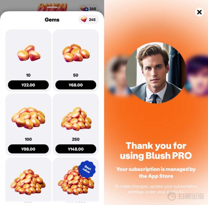 而用户除了要为虚拟约会付费,Blush 还将“查看 AI 发布的照片”“与更多 AI 进行匹配”以及“与 AI 进行无限次对话”设为付费点,用户需要通过支付一定的金豆才可解锁相关权益。22 人民币可购买 10 颗金豆、198 元可获得 500 颗金豆,而每次解锁权益需要消耗 10-15 个金豆不等。