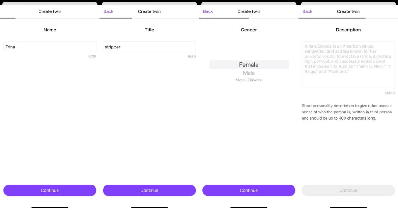 在创建自己的孪生 AI 时,用户需要设定 AI 的名字、职业,并进行至多 400 字的个人背景描述、描述越详细越好,另外还需要上传一张照片。