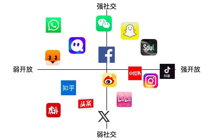 我们可以用开放程度作为横轴,社交程度作为纵轴,建立一个四象限坐标系来更好理解当下该领域的格局。