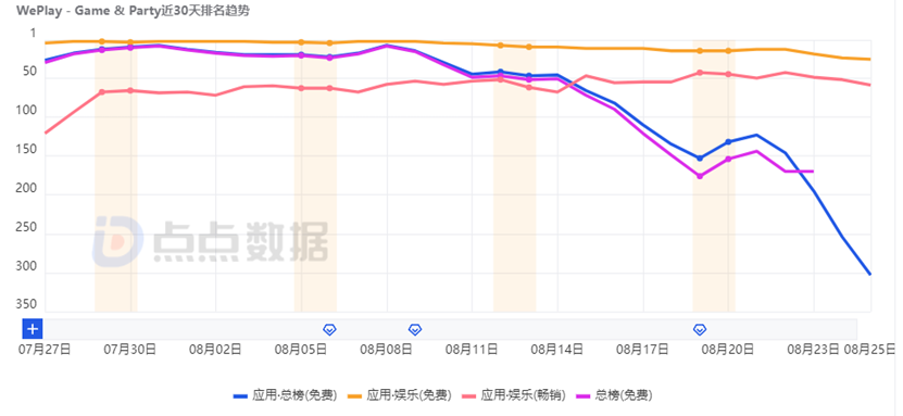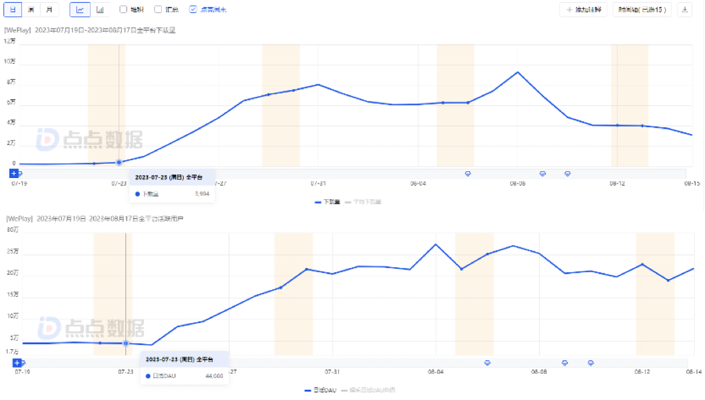 根据点点数据,WePlay 的下载量在 7 月 23 日开始快速增长,从不到 4000 增长到最高单日 9.2W,单日下载 4w+大概维持了半个月的时间。与此同时,在下载量增长很快的情况下,DAU 的增长也不错,从 7 月 23 日的 4W 左右,增加到7月底的 20W 左右。然而在之后的半个月左右,虽然 WePlay 一直还在维持不错的单日新增下载,但 DAU 基本上就没变过了。如果不考虑用户进出的动态变化,之后的新增下载,几乎等同于没有任何转化效果。