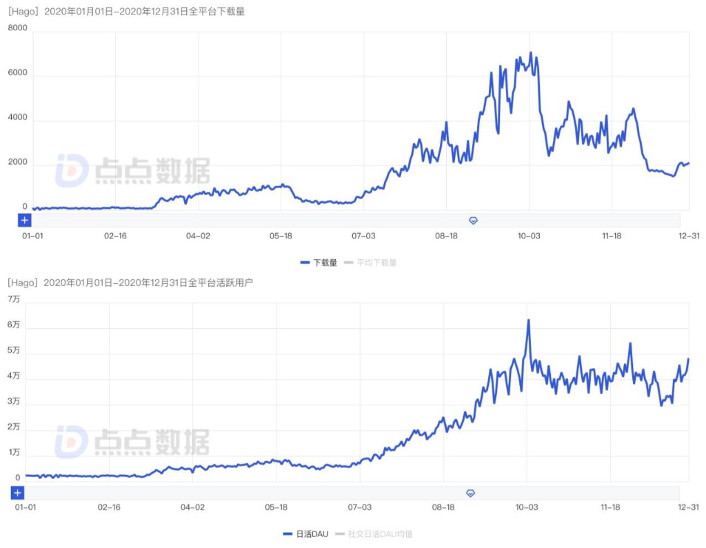 Hago 2020.1.1-2020.12.31 美国市场双端下载量和 DAU 数据|图片来源:点点数据