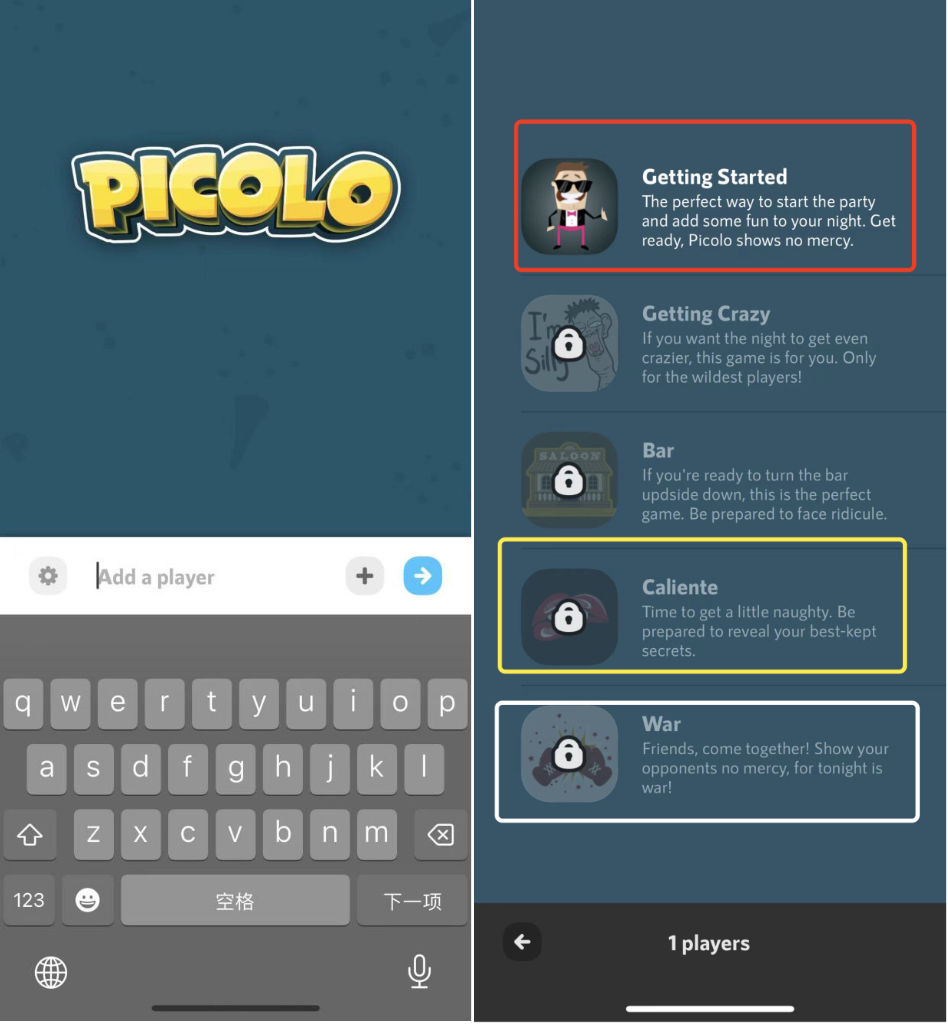 以 Picolo 为例,这个应用的基本功能就是为酒桌或 Party 提供小游戏和小挑战,类似于“真心话大冒险”。落地页就是添加玩家,玩家数量没有上限。游戏提供 5 种模式,红框中的模式是免费的,属于最基本的模式,尺度比较小。其他的几种模式尺度会更大一些,需要订阅才能玩,分别适应不同类型的 Party,比如图中黄框中的挑战偏向男女之间,对应比较暧昧的聚会场景,而白框中的挑战偏向对抗性,用户分成两队,一人失败,全队受罚。