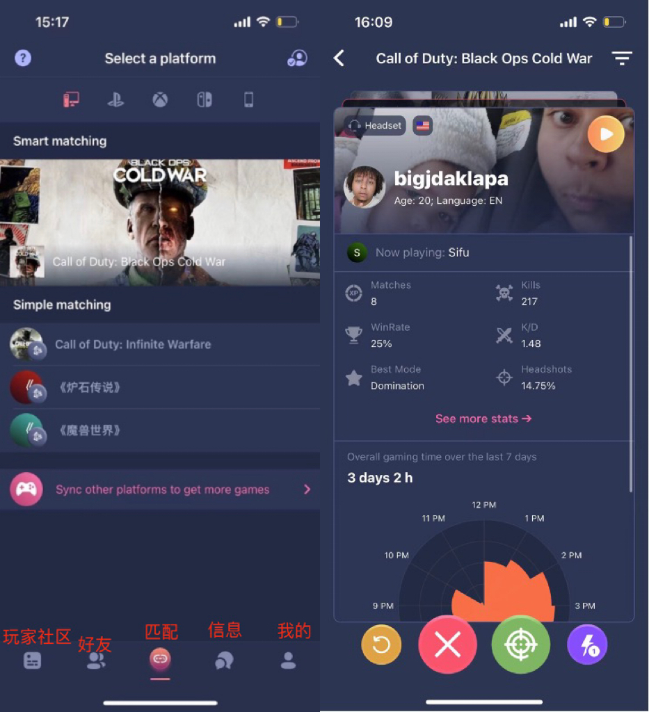 而这个匹配模式类似 Tinder 的 Swipe 方式,页面中推荐玩家的卡片中有对方的头像、年龄、语言、游戏数据、在线时间等基础信息,右划代表用户愿意进行组队,左划代表没有兴趣。互选的用户可以通过第二和第四个一级标签,“好友”和“信息”进行交互,可以进行文字聊天和语音开黑。