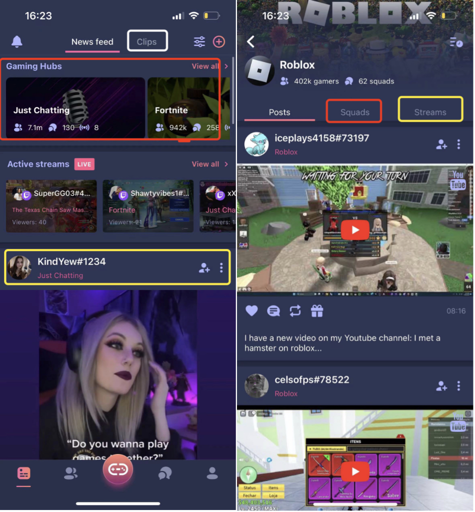 第一个一级标签值得单拿出来说一下,这个标签类似于一个玩家社区。当前页面 News feed 是推荐的其他用户发送的帖文内容和一些直播推荐,Clips 是短视频功能(上图左图白框),右图展现的是按游戏划分的社区页面(Game Hub)。在按游戏划分的社区页面,提供帖文,公开频道和 Twitch直播推荐 3 个小版块。