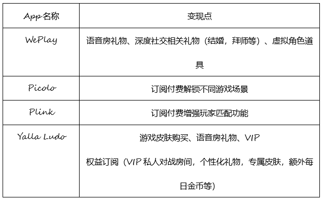 Yalla Ludo 虽然也是设计了一些社交层面的变现点,但一是有 Ludo 作为出发点(在美国,棋牌游戏普遍拥有不错的变现能力,但是它们一般都是以游戏道具、皮肤、体力等作为付费点,大多与游戏本身相关)、二是 Yalla Ludo 的社交变现点主要围绕游戏体验。但 WePlay 则是“游戏引流+社交变现”,游戏在里面打辅助,对用户的吸引力不足,而当社交作为主目的的时候,与美国用户的主体需求就不太相符了,从两款小游戏社交产品的渗透来看,只能服务于小部分人群。