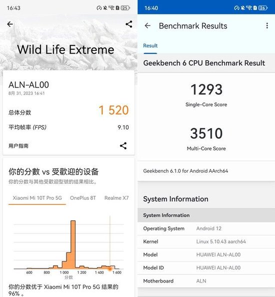 我们从Geekbench 6和3D Mark的跑分成绩来看,这颗麒麟9000S的性能大致在骁龙888~第一代骁龙8之间,联发科平台则是大约在天玑8100~天玑8200之间,日常使用以及轻度游戏还是没啥问题的。