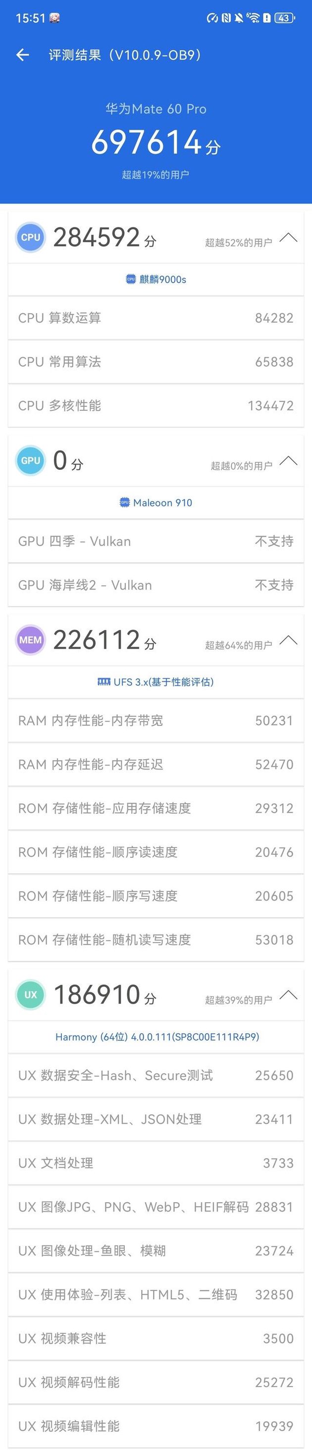 在安兔兔V10版本的测试中,暂不支持Maleoon-910 GPU的测试,所以华为Mate60 Pro在这一项测试中是0分。
