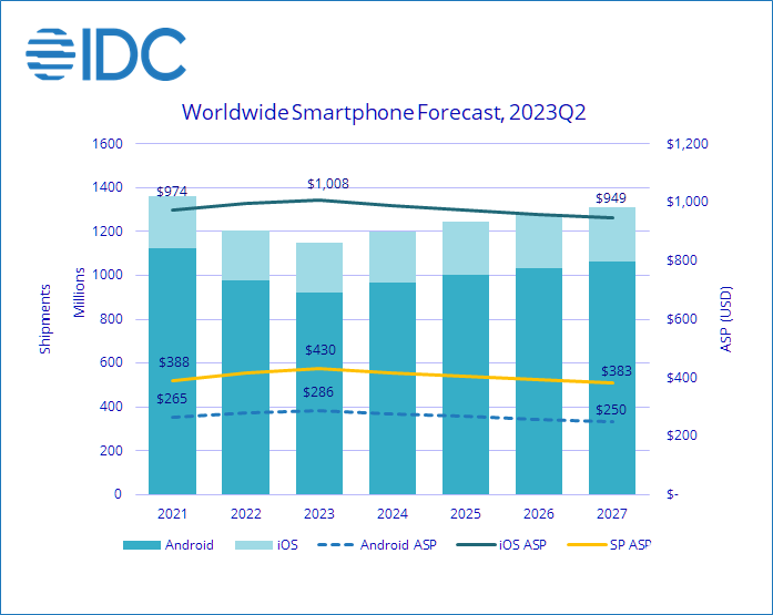 IDC披露的数据显示,预计2023年,全球智能手机出货量为11.5亿部,同比下跌4.7%,创十年来新低。