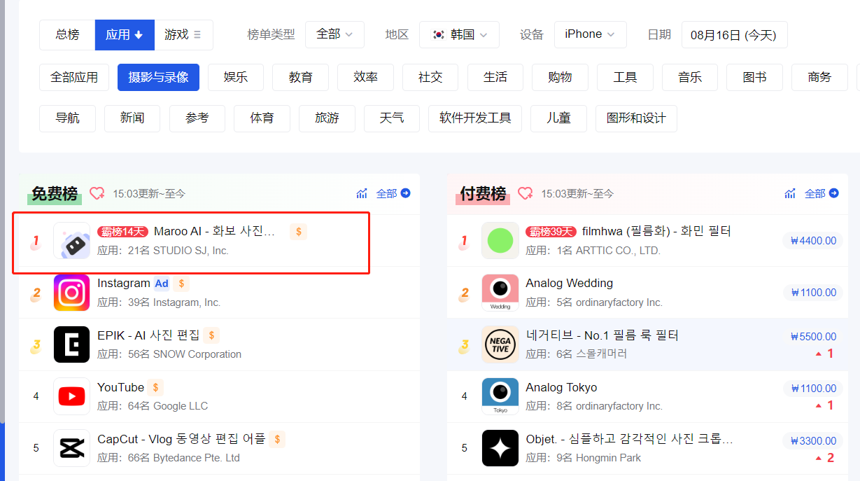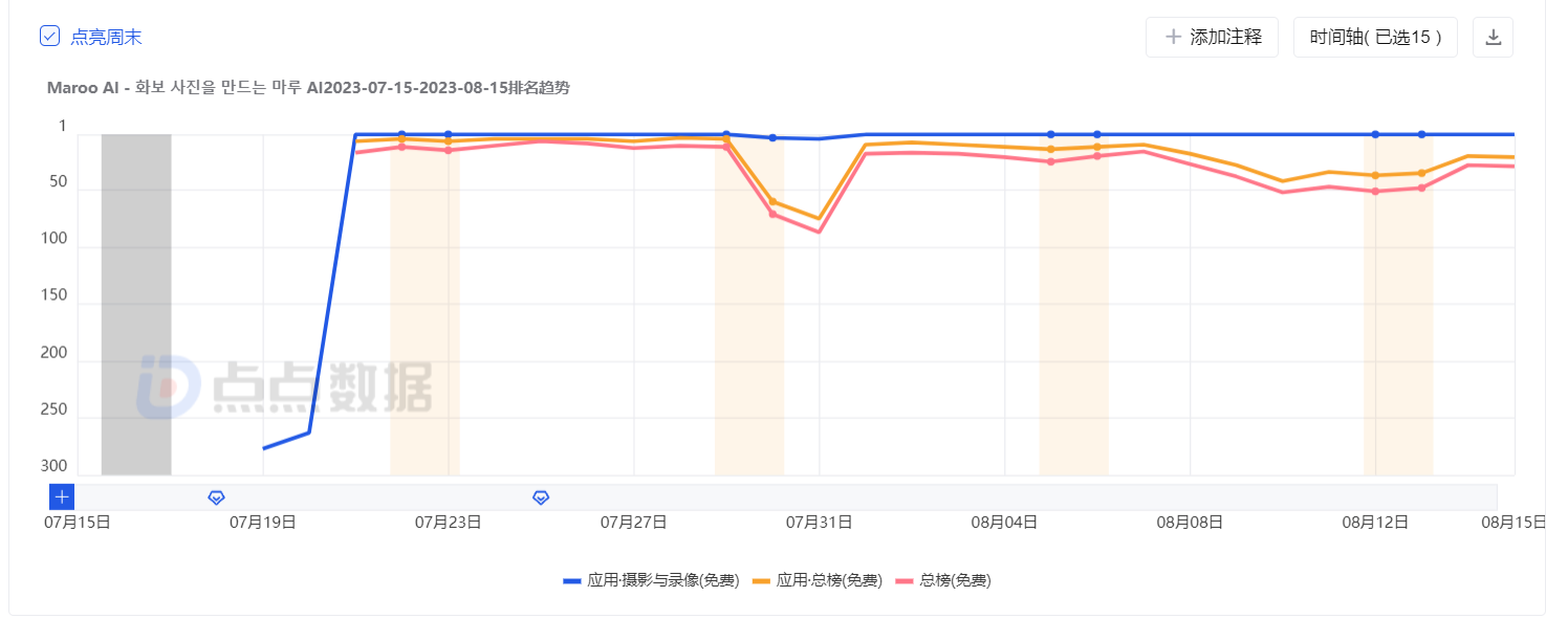 Maroo AI 6 月 15日上线,7 月 21 日出现在榜单后,始终保持在韩国 iOS 下载榜 Top100,在摄影&录像分榜霸榜 15 天。