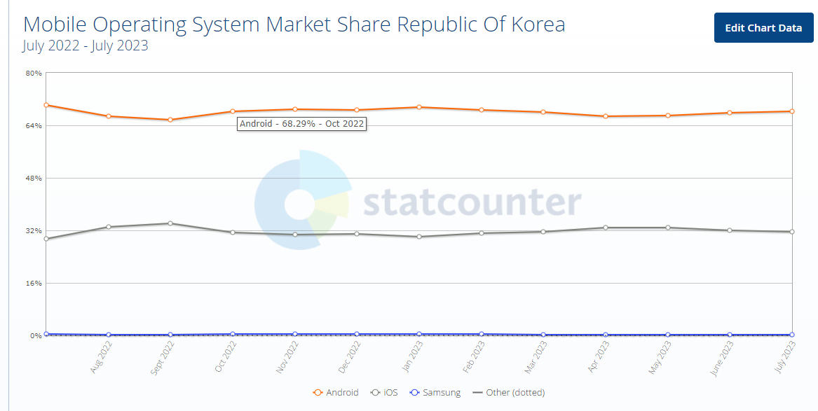 不过具体去看下载量绝对值时,会发现并不高,在韩国使用苹果手机的用户数量有限。根据 statcounter 最新统计,2023年 iOS 在韩国移动操作系统的占比为 31.49%。