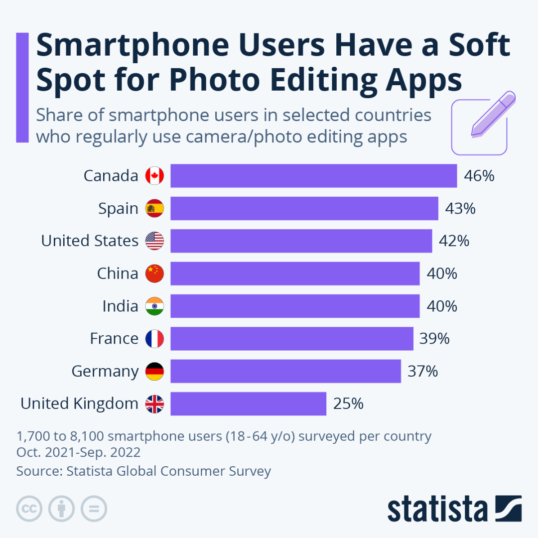 2022 年 Statista 全球客户调查显示,在主要市场中,近 40% 的智能手机用户经常使用照片编辑应用程序,这一比例甚至比电子邮件、浏览器和即时通讯应用程序等基本应用程序还要多。