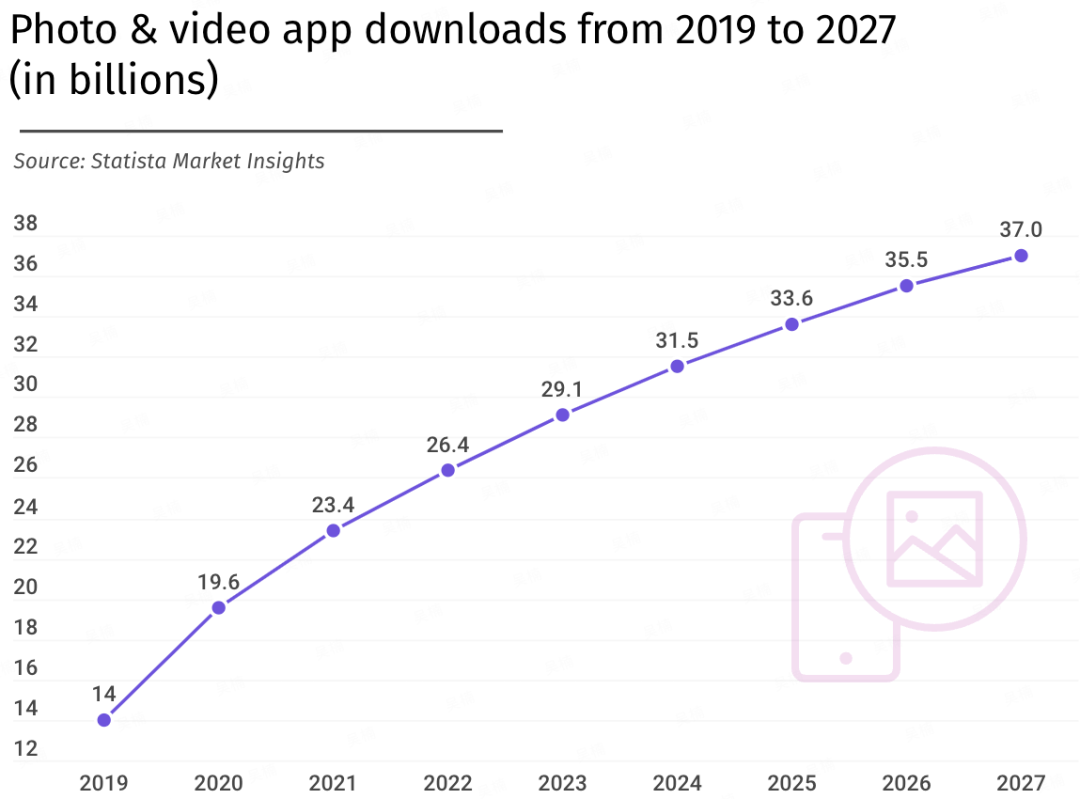 图:2019-2027 年照片和视频应用下载量,来源:Statista