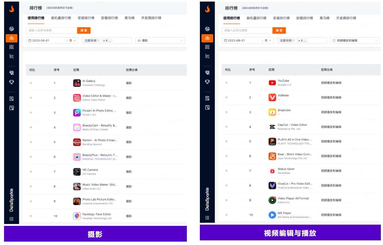 图:2023 年 8 月非洲摄影以及视频编辑与播放使用排行榜,来源:DataSparkle