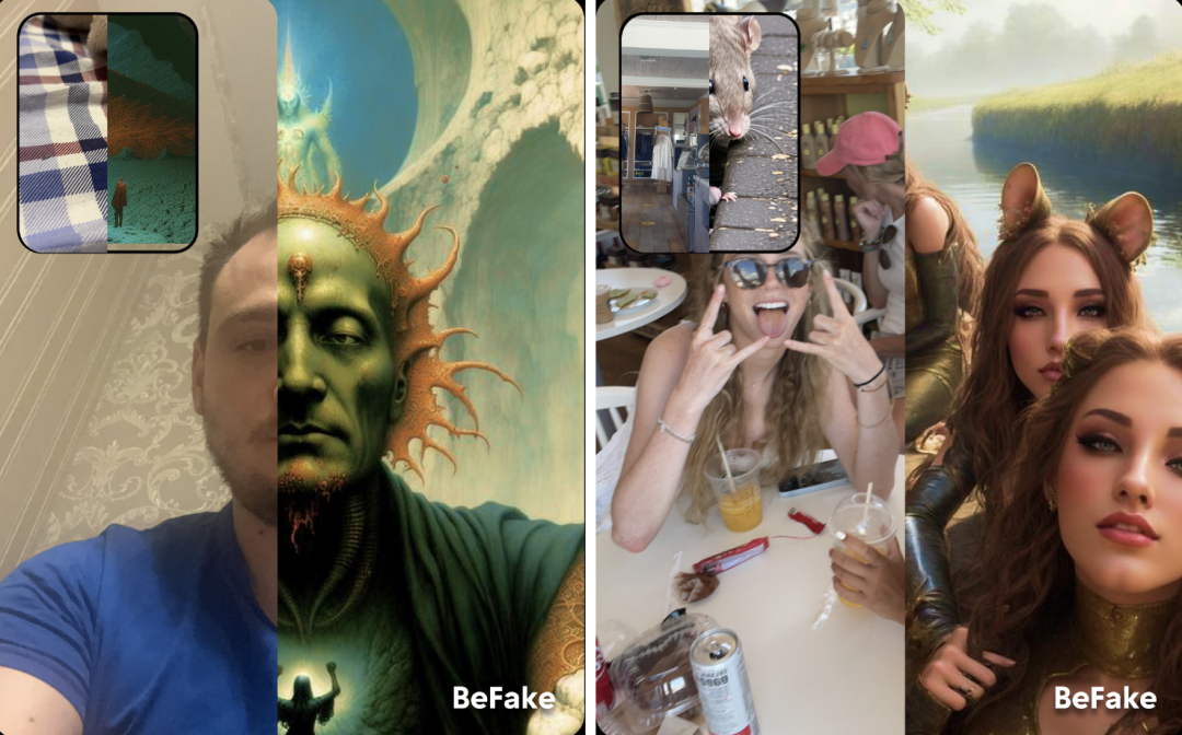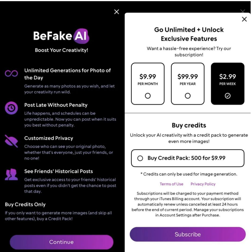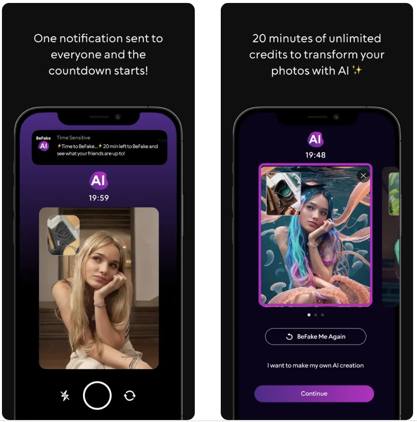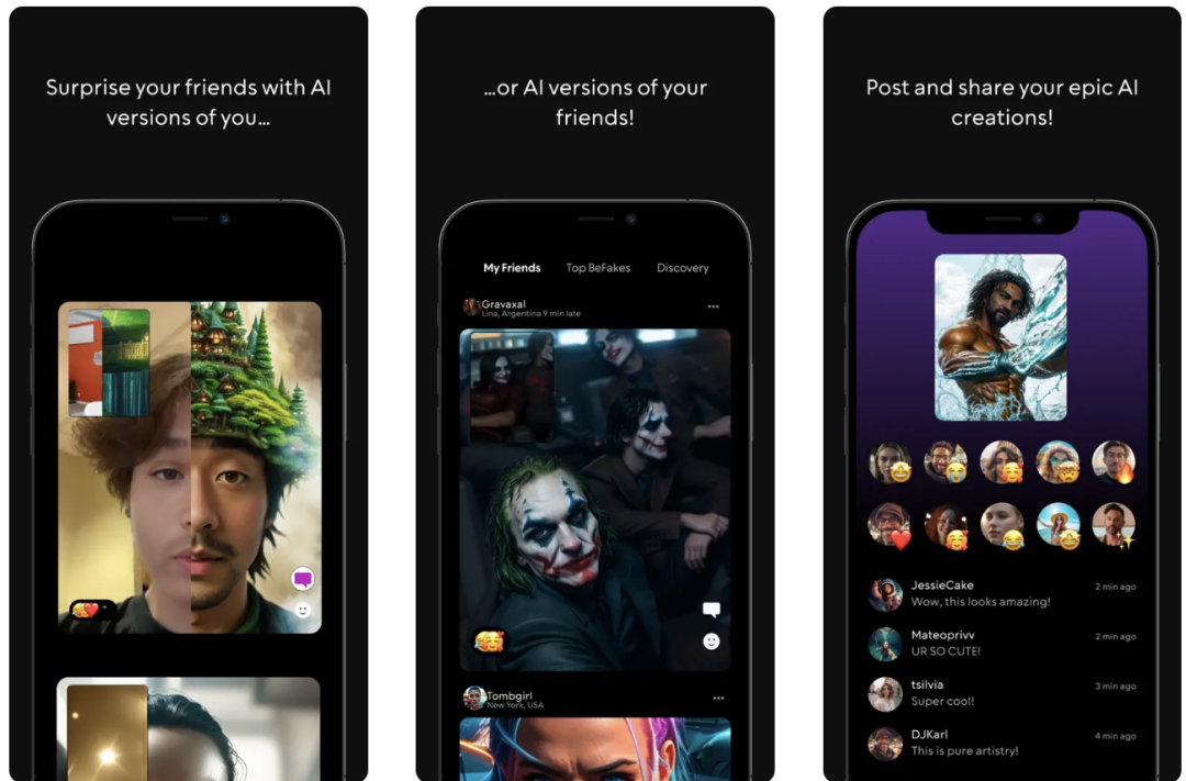 同时间的欧美,一款和 AI 沾边的自拍同样火了起来,不过。和妙鸭「相对真实」的路线相对,这款名为 BeFake 的完全走向了 AI 自拍的反面。BeFake 自称是「首个 AI 增强社交网络」,它彻底放弃了社交媒体的「真实性」,并借助 AI,将其「虚假性」发挥到了极致。这个 APP 鼓励用户进行天马行空的想象,大胆使用 AI 将日常照片转化为奇幻场景,然后再把这个「创意作品」分享给他人。正如它背后的公司,Alias Technologies,给这个 APP 下的定义:「一种表达渠道,通过 AI 生成的视觉效果,赋予用户与朋友联系的新方式。」和「妙鸭」的蹿红类似,BeFake AI 于 8 月份在 Google Play 和苹果商店上线,推出仅几周时间,就已人气爆棚,在美国、英国和法国的 App Store 免费排行榜上名列前茅。同时,团队已经拿到风投机构 300 万美元融资,而保持三位数的增长,也让 BeFake 在约谈下一轮融资时占尽优势。在 Snap、TikTok 滤镜早已经被玩坏的当下,为什么一款「制造虚假」的 App,还能让年轻人和投资人兴奋?BeFake 的成功,又揭示了哪些机会?BeFake 以黑色为 App 的主题色,还添加了和 icon 相同的深紫色,让 App 多了一点魔幻色彩。该应用提供了友好的用户界面,显示了各种可供探索的功能,主要就是三个不同的信息流,包括「好友 (friends)」、「热门 (top defects)」和「发现(discovery)」。用户完成手机号注册、建立账号后,就可以开始接收通知,并与 BeFake 社区互动、自由添加好友、浏览 AI 生成的图片。至于 APP 的核心玩法,BeFake 与 BeReal 如出一辙。每天的某个时间点,它会提醒你该拍照了,并同时激活你的前置和后置摄像头。不过,在 BeFake,你上传的不是未经编辑的原始照片,而是使用 AI 来编辑和发布照片。而且,从定时器响起的那一刻起,你会有 20 分钟的时间完成「上传。」编辑照片时,你可以使用 BeFake 现有的风格提示和自定义地点提示,生成壮观又超现实的图片,比如,你可以把背景换成「大峡谷」或「吉萨大金字塔」这样的世界地标,而不是分享另一张卧室里的照片。此外,你还可以输入自定义文本提示,如「把我们变成老鼠精灵」等,探索创造自己的数字世界的无限可能性。事实上,BeFake 尽力在让任何时刻都充满魔力,让你不再有无聊的帖子。对此,BeFake 的创始人之一 Dumont 也曾表示,「BeFake 可以在五秒钟内把无聊变成精彩。」而它真正的乐趣,也恰恰在于鼓励你发掘自己的创造力和想象力,来改变和创造你的图像。正如它的口号:既然「虚假」可以更有趣,为什么要去追求「真实」呢?毕竟,虽然照片是「假的」,但用户是「真的」——它就是你。当你拍照时,你能认出它,然后你用 AI 改造它,你仍然能认出它是你。你可以突破自己的局限,但它的中心仍然是你。对照片满意后,你可以「上传」AI 增强后的照片,到「好友 (friends)」信息流、或者「发现(discovery)」信息流,还可以分享到在其他社交媒体上。如果你具有超强的创造力,并在「发现(discovery)」信息流上公开发布图片,那么你绝对有可能积累一批粉丝。滚动浏览「热门 (top defects)」的图片帖子,你会看到 Jokers、龙、半机械人、远古的神、甚至还有奇怪的史努比狗。此外,用户还可以通过左右滑动,来对比查看原始照片和经过 AI 处理的照片。目前,BeFake 已登陆 iOS 和 Android 平台。它的基本功能是免费的,但高级用户可以通过「订阅」获得更多功能。比如,订阅用户就可以匿名发布自己的照片,甚至不必上传个人动态,就可以查看他人动态评论、进行评分或者做出其他反馈。此外,订阅福利还包括,可以延迟发帖而不会受到惩罚,查看朋友的过往动态,还有无限制地接收 AI 生成的提示,生成更多酷炫的图片等。用户可以按照周、月和年度订阅 BeFake,订阅费分别为 2.99 美元/周、9.99 美元/月或 99.99 美元/年,此外,还可以单独购买积分点数,500 点数只需 9.99 美元。BeFake 的商业模式到这里就十分清晰了——订阅付费。简而言之,BeFake AI 本质上是一款以 AI 生图为核心玩法的社交 App。它的用户友好界面,确保了从「想象」到「图片」的无缝体验。用户可以加入 BeFake 社区,通过「虚假」的表现方式「真实」地展示自己,与朋友分享自己的「创造力」。BeFake 是 AI 软件开发公司 Alias Technologies 旗下的第一款产品。这家公司成立于 2021 年,专门从事生成式媒体和多模态 AI 系统的开发。公司的创始人是 Kristen Garcia Dumont 和 Tracy Lane,此前,她们曾分别担任游戏巨头 Machine Zone 的 CEO 和 COO。Dumont 领导开发并推出了两款全球最赚钱的移动社交游戏:《世界大战:崛起》和《最终幻想 15:新帝国》,总收入超过 10 亿美元。Lane 则负责社区、管理、合规和平台合作。Kristen Garcia Dumont 是 BeFake 的首席执行官|BeFake在做游戏的几年里,她们发现,游戏玩家在不使用真实身份的情况下,也能通过平台算法,建立深厚的联系、并产生很好的交互。这让她们意识到,「实际上,你可以建立一个围绕共同兴趣的人际网络。对于游戏,共同兴趣就是游戏。对于社交网络来说,共同的兴趣可以是创造真正有创意的 AI 作品的乐趣。」于是,将 AI 和计算机视觉与社交网络相结合,通过 AI 打破「人际交往的障碍」,就成了她们的计划。随即,这两位创始人开始了 BeFake AI 这一项目,旨在通过培养一个「创意社区」,鼓励用户通过创造富有想象力的 AI 内容,建立联系,从而开创人与 AI 交互的新形式,实现社交媒体的「民主化。