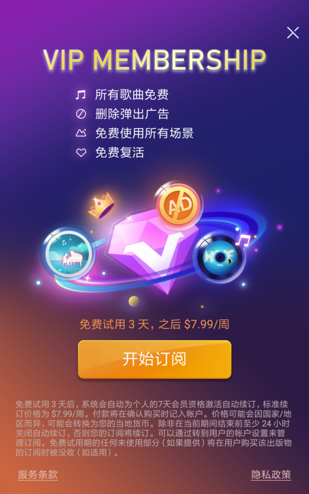 《Piano Fire》采用了混合变现模式,但明显广告变现为主导,主要体现在观看广告兑换曲目、续命、兑换金币、钻石等场景。游戏商店主要出售金币、钻石、音乐包等,可以直接充值购买。另外,游戏也支持订阅制,购买会员后可享受所有曲目免费、无广告、免费续命等特权。