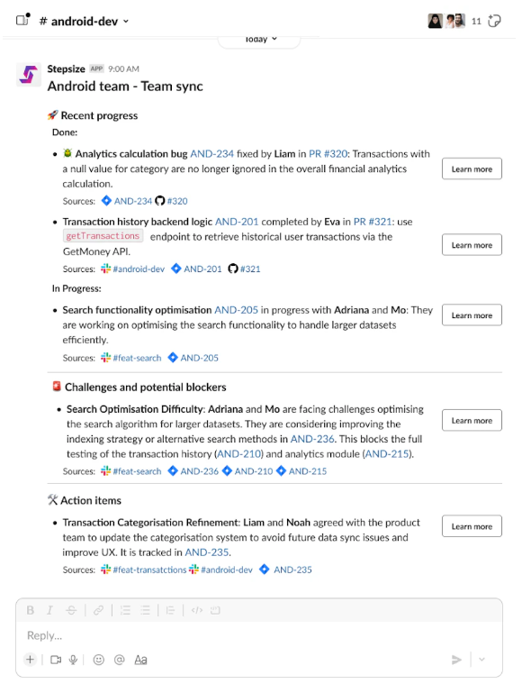 Stepsize AI的运营智能引擎(Operational Intelligence Engine)能够观察和反映你正在使用的协同工具(包括Slack、Jira、Linear和GitHub)里发生的一切。
