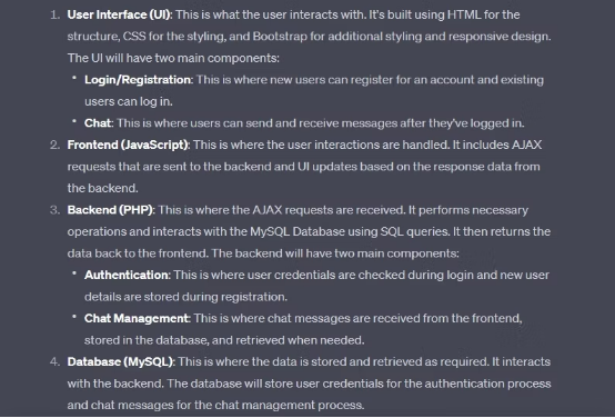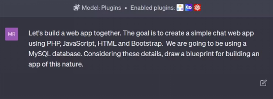 对于我们的第一个任务,我们让ChatGPT为一个简单的聊天应用程序开发一个蓝图。为此,我们描述了这个Web应用程序的需求,然后让聊天机器人详细制定开发该应用程序的计划。