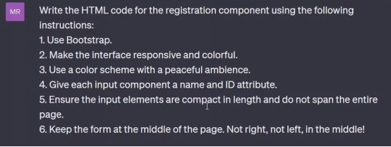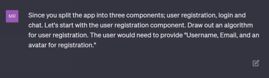 我们径直开始构建注册组件。我们让ChatGPT设计出一个合适的算法。在这里,我们通过指定只需要用户的用户名、电子邮件和注册头像来进行干预。下面是提示: