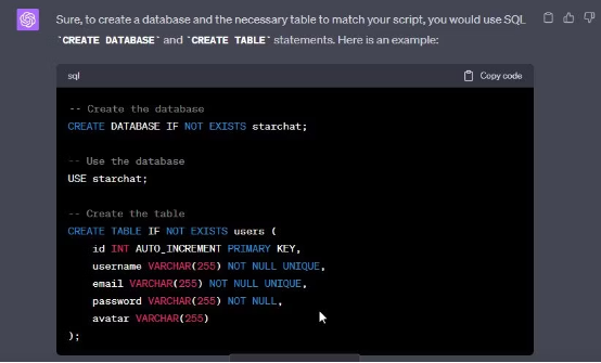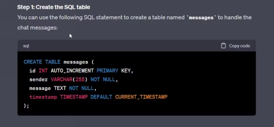 对界面感到满意后,我们继续构建脚本来处理聊天逻辑。为了能够从数据库中发送和获取消息,ChatGPT正确地强调了我们需要一个“消息”表。我们让聊天机器人为消息表创建一个SQL。