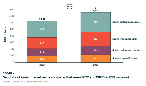 除此之外,FILA 等其他品牌也在扩展沙特市场。但从公开消息看,国内品牌除了 2021 年森马在利亚得开店,暂未有太多其他开拓信息。但显然,沙特是个值得关注的运动服装市场,预计到 2027 年,运动服装市场将比 2022 年增长 21%,达到约 15 亿美元的规模。