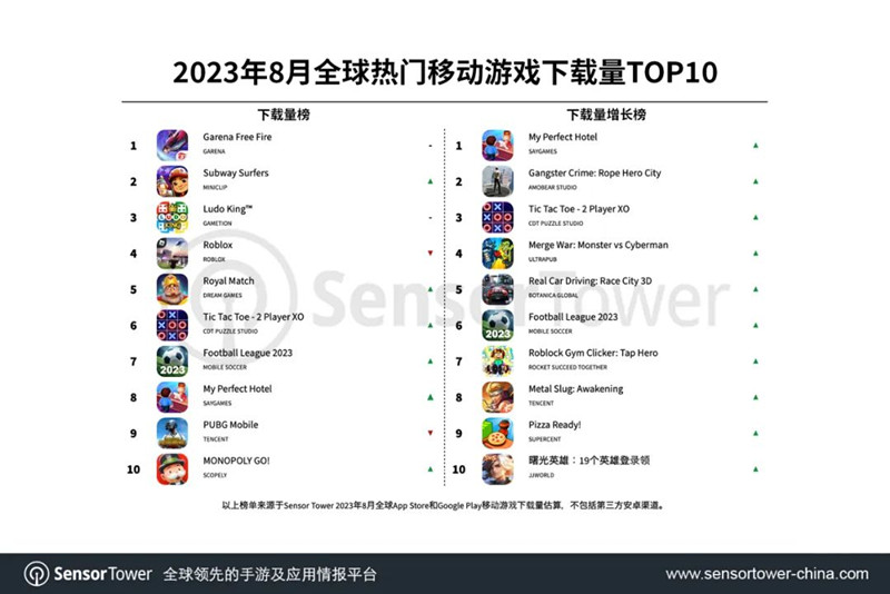 原标题:2023年8月全球热门移动游戏下载量TOP10