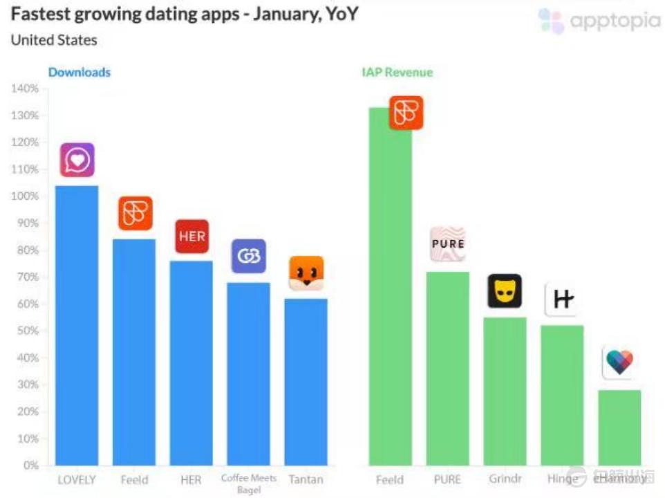 在 apptopia 发布的 2022 年 1 月美国市场下载和内购营收同比增长 Top5 交友应用中,Feeld下载增量排名第 2,营收增量远超第二名稳列第一。